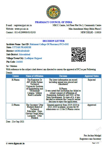 Rukmani College of Pharmacy is a well established in Uttar Pradesh, Moradabad having a high profile with interdisciplinary areas of specializations in Pharmacy.